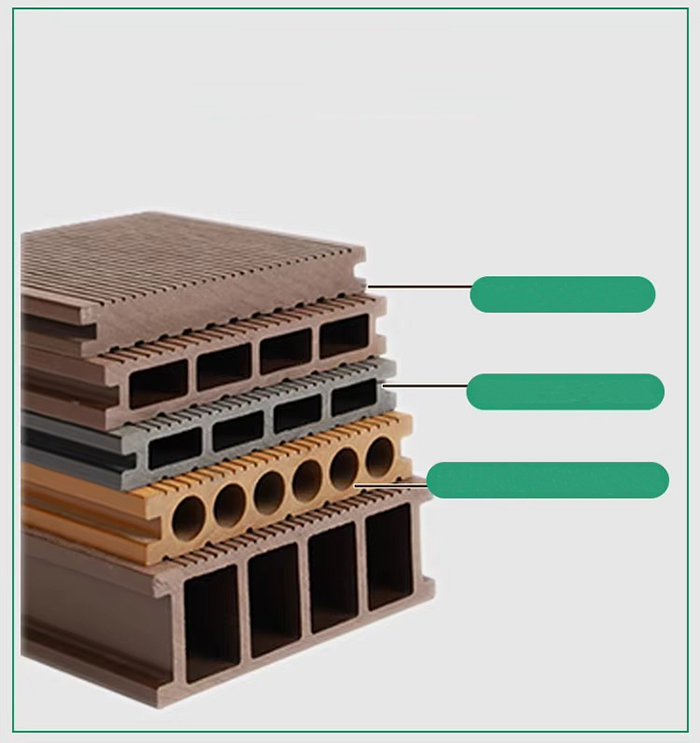 اختلاط بستر الیاف چوب (50-60%) رزین پی وی سی (30-40%) لایه ضد خوردگی فیبر کربن (5-10%)، افزودن ضد اشتعال هیدروکسید آلومینیوم برای بهبود درجه A2.