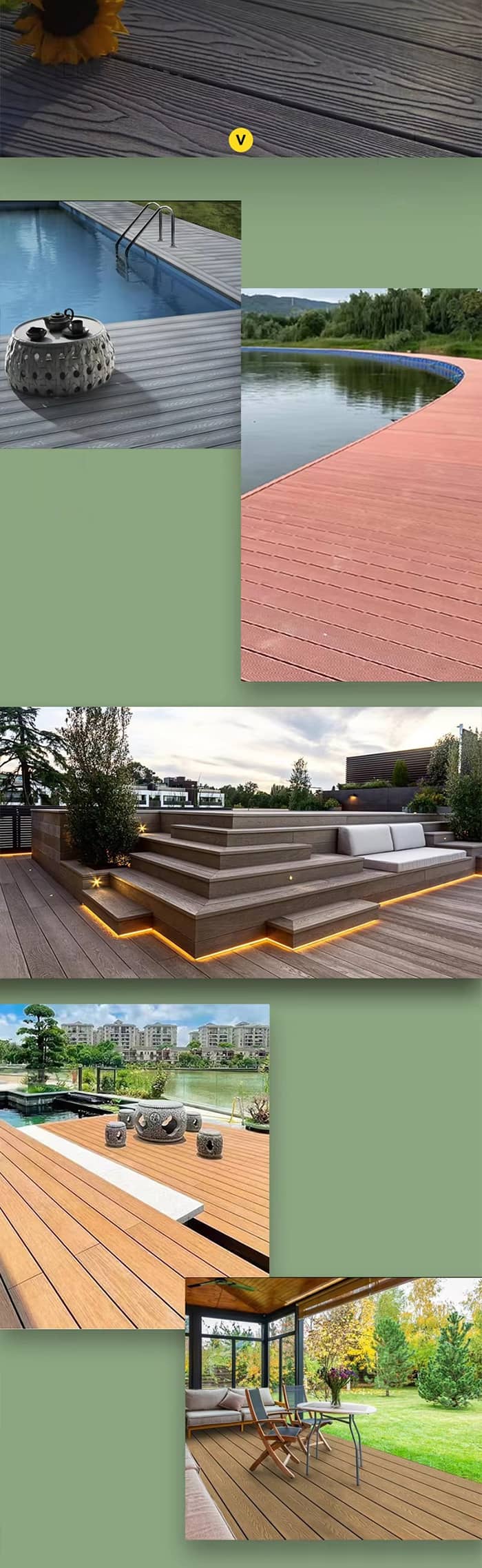 محیط بیرون: مانند تراس ها، عرشه ها، مسیرهای باغ، خیابان های عابر پیاده تجاری و غیره، با مقاومت قوی در برابر آب و هوا، ضد حشرات، مناسب برای استفاده در فضای باز